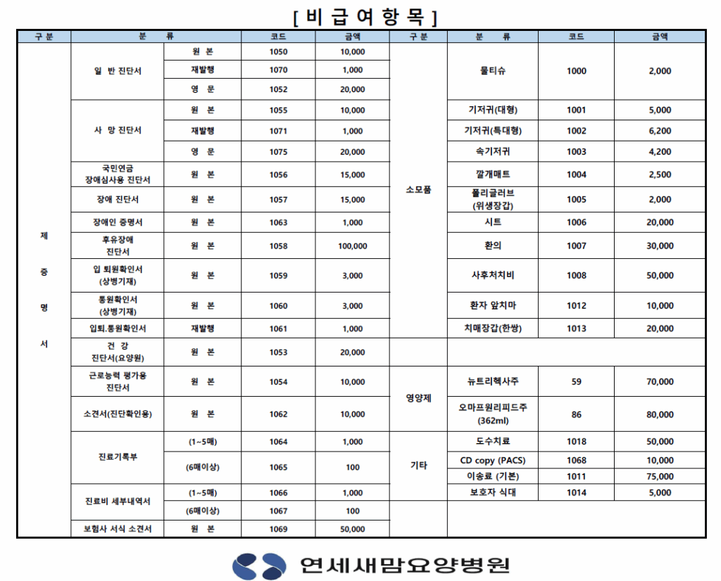 yonsei saemom 비급여 안내 비급여 진료비 안내 의료법 제45조(비급여 진료비용 등의 고지) 및 동 법 시행규칙 제42조 2의 2항에 따라 비급여 진료비용을 환자 또는 환자의 보호자가 쉽게 알 수 있도록 보건복지부령으로 정하는 바에 따라 고지하오니 참고하시기 바랍니다.
